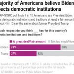 An overwhelming majority of Americans, 70%, say they believe Biden respects democratic institutions at least a fair amount. But there is a stark political split with about 96% of Democrats saying Biden respects such institutions, compared with about 42% of Republicans.