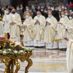 Except for the pope and members of a chorus made up of boys and adults, participants in the Mass wore face as part of COVID-19 precautions.