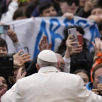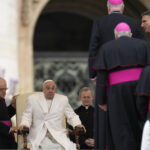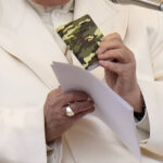 At the end of his general audience, Francis also showed tourists and pilgrims in St. Peter’s Square the rosary and camouflaged New Testament book that a 23-year-old Ukrainian soldier named Oleksandre had with him when he was killed in the eastern city of Avdijevka.