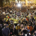 Crowds began to march toward the city’s federal courthouse around 9:15 p.m., some marching from 5 miles away. A large group of demonstrators in the North Portland neighborhood also paraded by the police precinct there, which was roped off and had officers in riot gear standing outside the building.