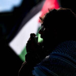 At Emerson College in Boston, some students took off their graduation robes and left them on stage. Others emblazoned “free Palestine” on their mortar boards. One woman, staring at a camera broadcasting a livestream to the public, unzipped her robe to show a kaffiyeh, the black and white checkered scarf commonly worn by Palestinians, and flashed a watermelon painted on her hand. Both are symbols of solidarity with those living in the occupied territories.
