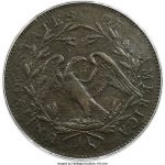 Known as a pattern, the front features the flowing hair portrait of Liberty and the date 1794, while the reverse side shows a small eagle on a rock within a wreath. Similar starless examples are part of the Smithsonian Institution’s National Numismatic Collection.