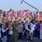 After the signing ceremony of treaties to join Russia, Moscow-installed leaders of the occupied regions gathered around Putin and they all linked hands, before then joining chants of “Russia! Russia!” with the audience.