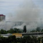 A billowing pillar of smoke filled the air with an acrid odor in Kyiv’s eastern Darnystki district over the charred, blackened wreckage of a warehouse-type structure. Soldiers blocked off a nearby road leading toward a large railway yard.