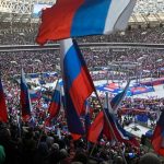 Moscow police said more than 200,000 people were in and around the Luzhniki stadium. The event included patriotic songs, including a performance of “Made in the U.S.S.R.,” with the opening lines “Ukraine and Crimea, Belarus and Moldova, it’s all my country.”