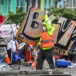 After police dispersed the protesters, heavy equipment was brought in to remove the concrete barriers that demonstrators had erected to block roads. Debris from the encampments was carted away on flatbed trucks as officers strung yellow caution tape from tree to tree warning people not to reenter.