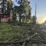Standing water and tree debris still covers the grounds of Faith Baptist Church. The church called on parishioners to come “pray for our community” in a message posted to the congregation’s Facebook page.