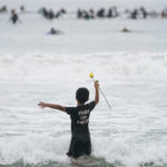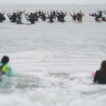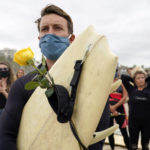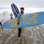 More than 200 surfers of all ages and races paddled through a set of crashing waves under cloudy skies to form a massive circle near the Santa Monica Pier, where they chanted Floyd’s name nine times to mark the nearly nine minutes prosecutors say his neck was pinned to the ground under the knee of a white Minneapolis police officer.