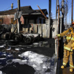 The truck’s smoldering gas tank lay on its side in the parking lot with one end blown open. More than an hour after the explosion, firefighters were still clambering on the roof of the charred home nearby.