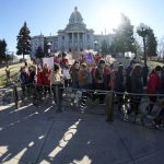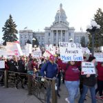 The teachers Friday gathered on the steps in front of the Colorado capitol for speeches and chants, then circled the building as some played brass instruments and drums before filing inside.