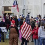Police blocked off streets surrounding the Capitol building, but as of noon people remained, shouting “Arrest Kate Brown.” One person climbed on top of a 20-foot tall relief sculpture, next to the front steps of the building, and waved an American flag as people cheered.