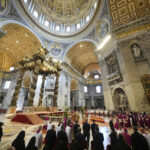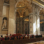They made their way slowly to the main altar of the 16th-century St. Peter’s Basilica, where Francis’ simple wooden casket was perched on a slight ramp, as four Swiss Guards stood at attention.
