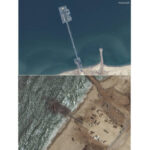 APRIL 30: Satellite photos show the U.S. Navy ship USNS Roy P. Benavidez and Army vessels working on assembling the pier and causeway about 11 kilometers (6.8 miles) from the port on shore.