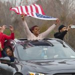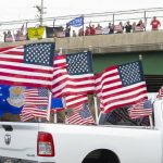 A video posted on Twitter showed trucks passing under a large American flag hoisted in the air by two cranes. Supporters stood along a road waving as the drivers left the speedway.