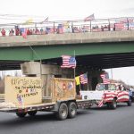 People crowded onto overpasses, waving at the “People’s Convoy” and holding signs and American flags. Within the convoy, there were tractor-trailers with horns blaring and some recreational vehicles and pickup trucks occasionally going by, mixed with the normal traffic on Interstate 495 in Silver Springs, Md.