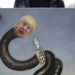 Many paused to photograph a robotic likeness of Trump sitting on a golden toilet, cell phone in hand. The robot caught the attention of passers-by with its recitation of catchphrases including “No collusion” and “You are fake news.”