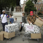 Leaders of Britain’s main opposition party joined demonstrators later at the rally, just up the street from May’s Downing St. office. Police have erected barricades to stop protesters marching past the gates of Downing St.