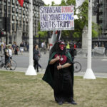 One group came dressed in the red cloaks and bonnets of characters from Margaret Atwood’s “The Handmaid’s Tale,” which is set in a dystopian, misogynist future America.