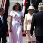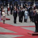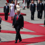 Trump then walked by himself down a red carpet and stood at attention atop another platform, listening to a military band. Then he continued down the red carpet to review Japanese troops while Naruito and both men’s wives held back.