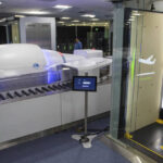 Instead of a boxy belt-fed device using a stack of gray trays, the futuristic-looking baggage and personal belongings inspection system looks like a scaled-down starship medical magnetic resonance imaging machine. It uses an automated bin return that sanitizes trays with germ-killing ultraviolet light between users.