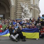 In Odesa, the Black Sea port, residents draped themselves in Ukraine’s blue-and-yellow flags, shared Champagne and held up flag-colored cards with the word “Kherson” on them.