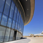 Behind the spaceport’s signature wall of curved glass, mission control sits on the second floor with an unobstructed view of the runway and beyond.
