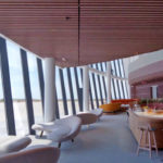 Earthen tones help ground visitors on the first floor. The social hub includes an interactive digital walkway and a coffee bar made of Italian marble. On the upper deck, shades of white and gray speak to Virgin Galactic’s more lofty mission.