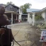 “Whatcha doing here, man?” Officer Chris Smith asked as he walked up to Jennings, who held a hose with a stream of water falling on plants beside the driveway outside a small, white house.