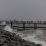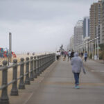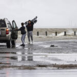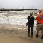 Aaron Montgomery, 38, said he noticed a leak in the roof of his family’s new home in Williamsburg, Virginia. They were still able to make the hour-long drive for his wife’s birthday to Virginia Beach, where he said the surf and wind were strong but the rain had stopped.