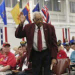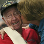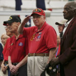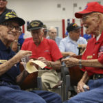 Many of the veterans honored Tuesday wore red, white or blue clothing. A number sported hats proudly proclaiming their WWII service or wore U.S. flag pins.
