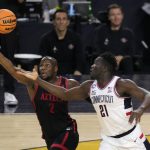His biggest offensive rebound came after UConn’s once-comfortable lead had shrunk, the pressure rising. Tristen Newton drove into the paint and launched a floater that bounced off the back of the rim, only for Sanogo to jostle a San Diego State rebounder for position and bat the ball with his right hand off the backboard and straight through the net for a 58-50 lead with 7:12 left.