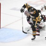From his own left corner, Provorov tried to clear the puck out of the zone with a backhander, but Rakell managed to pinch it off near the visiting bench. Linemate Sidney Crosby picked up the errant puck, curled around the top of the slot to the right circle and backhanded a pass to the opposite circle. Penguins forward Bryan Rust accepted the puck and coolly slid a forehand pass to the top of the crease where Rakell easily re-directed a forehand shot by Merzlikins’ glove. Rust and Crosby collected assists.