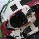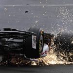The “halo” device protecting Zhou’s head was scraped back to bare metal after being dragged through the gravel and a chunk of the air intake behind the driver was torn away.