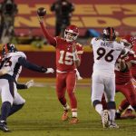 The Chiefs didn’t take the lead until Butker’s fourth field goal early in the second half, then answered the second Lock-to-Patrick touchdown connection with a TD of their own. With a defender hanging on his jersey, Mahomes tossed a 15-yard scoring pass to Kelce, ending their streak of seven straight red-zone trips without a touchdown.