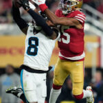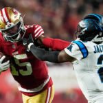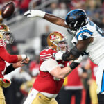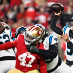 The two offenses did nothing after that. Purdy became the first player to throw three interceptions — Jaycee Horn got two of them — in the first half all season, but the Panthers turned those into only three points. Young ruined one drive when he was intercepted by Brown on a first-down play from the 1.