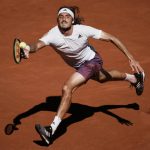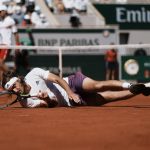 Djokovic’s left him prone on the sideline after a head-first fall near a net post. Tsitsipas slipped by the baseline, smearing his white shirt and purple shorts with the rust-colored surface.