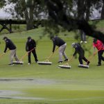 Heavy rain fell most of the back nine for the leaders, with workers using squeegees to clear paths on greens and one ball stuck in the middle of a fast-moving stream on the 18th fairway. The players slogged through the deluge before lightning forced a delay.