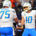 In his third full game with his broken non-throwing (left) hand heavily protected, Herbert led the Chargers to touchdowns on all three drives in the first half. Omarion Hampton scored on a 5-yard run in the second half.
