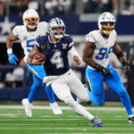 A 23-yard TD toss to Quentin Johnston, who played college football a few miles from the home of the Cowboys at TCU, was followed by 25-yarder to Ladd McConkey before Herbert’s 1-yard plunge on a modified version of the tush push. Johnston had four catches for 104 yards.