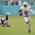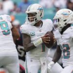 Tagovailoa completed 26 of 32 passes for 315 yards. He threw an 18-yard touchdown pass to Jaylen Waddle and a 29-yard TD pass to De’Von Achane. Tyreek Hill caught six passes for 109 yards, including a 47-yard catch in the third quarter — the star receiver’s first reception of more than 30 yards since last season’s opener.