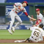 When the Cardinals turned to right-handed reliever Chris Roycroft in the seventh, Jack Suwinski singled to left then raced to third on Joshua Palacios’ pinch-hit single to right to put runners on the corners. But Bart hit a bouncer to third baseman Nolan Arenado, who was playing on the edge of the grass and threw Suwinski out at home plate, and McCutchen grounded into a forceout at second to end the rally.