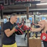 His class has people of all ages with a mix of strength, conditioning and boxing, and a soundtrack of gloves hitting pads and throwback R&B jams. Every once in a while, he shows his skills for eager volunteers.