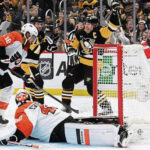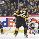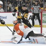 After Rakell won a puck battle in Philadelphia’s right corner against Flyers defenseman Sean Walker, Crosby claimed possession and dished a pass to the center point for Penguins defenseman Marcus Pettersson who gripped and ripped a wrister. Gliding through traffic above the crease, Rust deflected the puck with his stick through a keyhole-narrow opening between Petersen’s blocker and left hip. Pettersson and Crosby claimed assists.