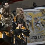 Letang was joined on the ice by his son, wife, Catherine, and daughter, Victoria, as the Penguins showcased their appreciation for his career with a tribute video played on the PPG Paints Arena jumboscreen.