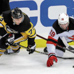 The Penguins fell behind 2-0 in a two-minute span of the first period. The first goal came after a high dump-in by Steven Santini into the left-wing corner bounced past Letang and onto Miles Wood’s stick for a pass to Zajac. The second came on a long-range wrister from Damon Severson.