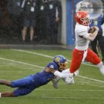 Ezzard’s second TD was a 15-yarder late in the first half, when he was wide open in the end zone. That occurred shortly after the game resumed following a 74-minute delay because of lightning. The halftime break was shortened to three minutes.