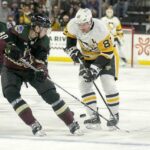 Penguins center Sidney Crosby tied former teammate and assistant coach Mark Recchi for 21st on the list with his 27th goal of the season in Monday’s 5-2 loss to the Coyotes in Arizona.