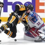 Lugging the puck from his own right circle, Rangers defenseman Matthew Robertson chipped it up ice to the Penguins’ right corner. Trocheck chased it down, beating Penguins defenseman Ryan Shea, and snapped a forehand pass to the lower rim of the far circle, where an open Lafreniere fired a wrister. The puck struck off the sticks of Penguins forward Egor Chinakhov and Kulak, then deflected past Skinner’s glove on the far side. Trocheck and Robertson registered assists.