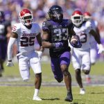 At 6 feet and 220 pounds, Miller has 1,260 yards and 16 touchdowns rushing for TCU. His 13 games in a row running for a TD mark the longest active FBS streak, and is two short of LaDainian Tomlinson’s school record. Miller had 153 yards with two second-half TDs in the comeback against the Wildcats.