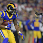 Gurley tied a season high with 97 yards on 25 carries, scoring on a 1-yard carry up the middle with 3:28 remaining in the first half to extend Los Angeles’ lead to 10-0.